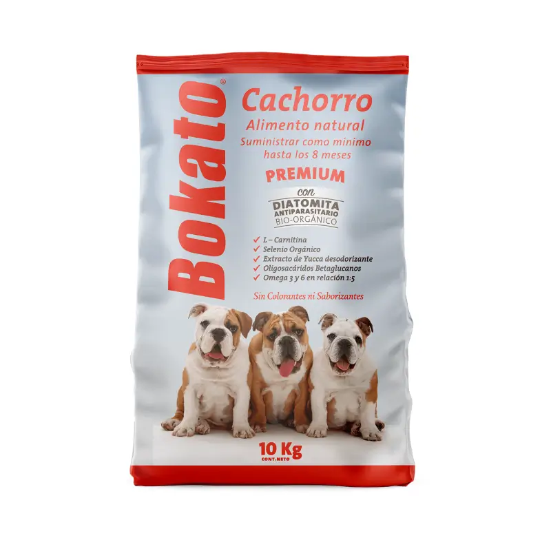 Bokato Cachorro. Contiene un complejo vitamínico enriquecido para perros en etapa de crecimiento y madres lactantes. Tiene Diatomita, que es un excelente antiparasitario natural con proteínas 27% y extracto etéreo 12%.