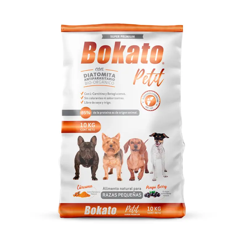 Bokato Petit. El mejor alimento para perros adultos de razas pequeñas. Otorga a las mascotas proteínas de alta digestibilidad para su óptimo crecimiento, desarrollo muscular y un pelaje fuerte y brillante. Contiene 27% de proteína de carne, siendo un 85% de ella de origen animal. Incluye plasma sanguíneo, fuente natural de inmunoglobulinas. Para mordida pequeña.