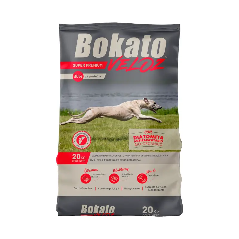 Bokato Veloz. Pensado para perros de alto rendimiento y gran actividad física, el alimento Bokato Veloz es la mejor alternativa para ellos, ya que contiene un alto nivel de proteínas (87% de ella es de origen animal), extracto etéreo (13%), Omega 3, 6 y 9 y L-Carnitina, entre otras cosas. Además contiene condoprotectores para el cuidado articular.