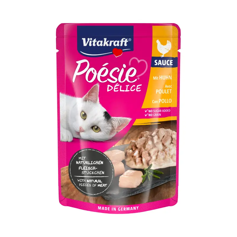Estos deliciosos aperitivos con tierno filete de pollo en abundante salsa ofrece una suave textura que encantará a tu gato. ¡Todo tu amor está en esta bolsita Poésie Déli Sauce!