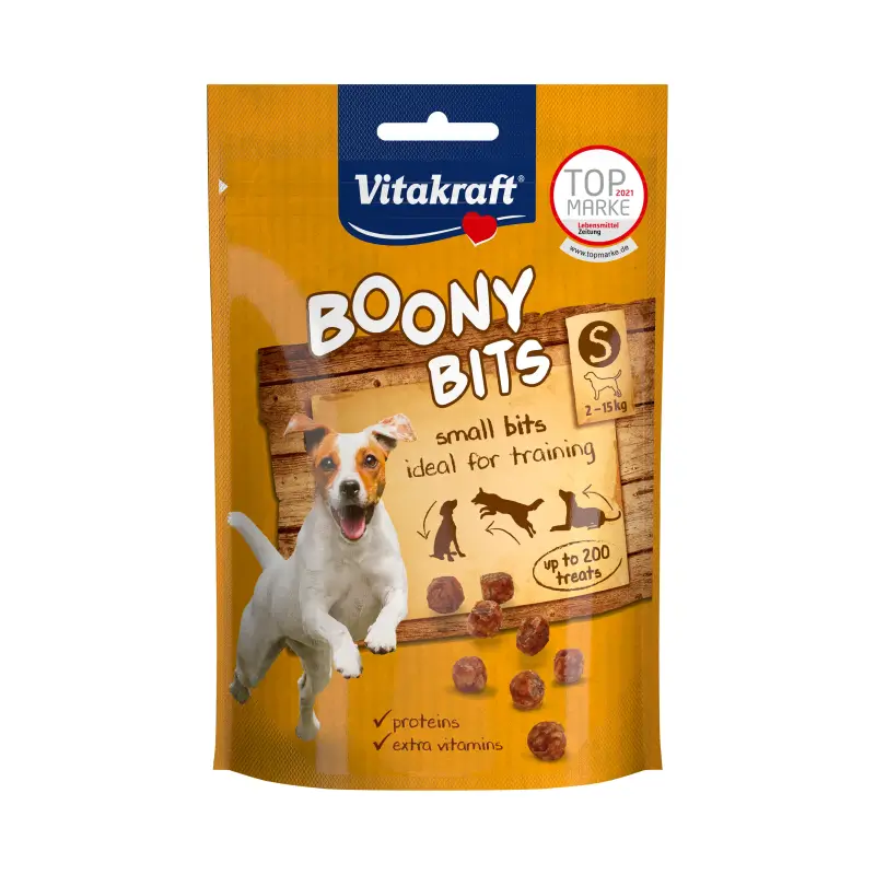 Los Boony Bits extrapequeños no sólo son una golosina irresistible para los perros pequeños, sino que también son un excelente tentempié para el adiestramiento. Puede motivar o recompensar a su amigo de cuatro patas hasta 200 veces, sin que los mini bocadillos de carne se vuelvan desagradablemente desmenuzables o grasientos en el bolsillo. Los Boony Bits se elaboran sin azúcares añadidos y contienen valiosas vitaminas. Ideal para todos los perros.